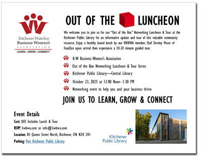 We are excited for our upcoming Out of the Box Luncheon and tour at Kitchener Public Library (KPL), Thursday, October 23rd .